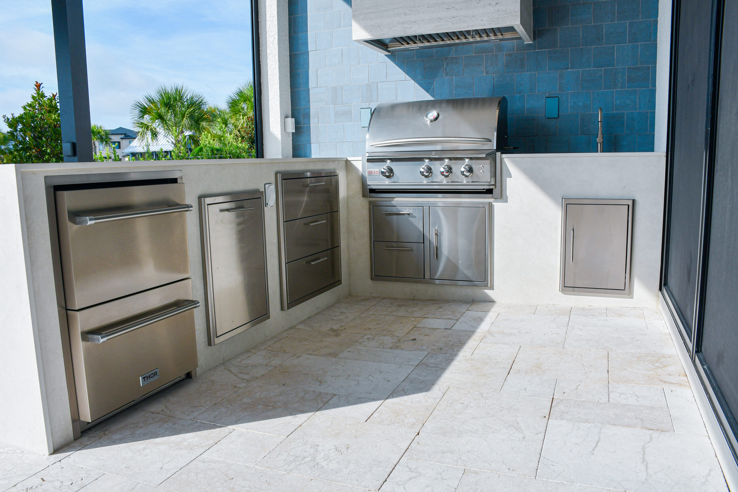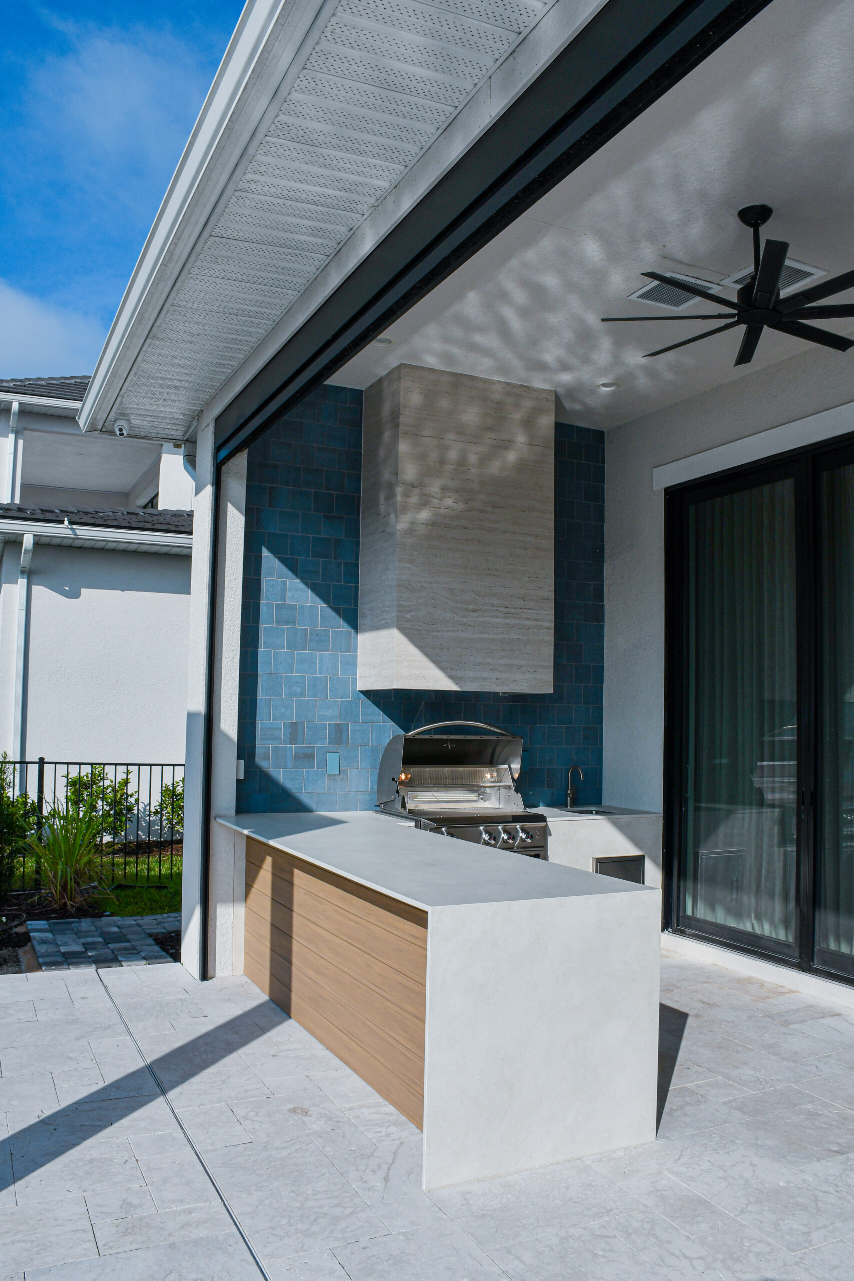 No outdoor space is complete without a high-performance kitchen. This project features Blaze appliances, a trusted name in outdoor cooking for their quality, durability, and professional-grade performance. In addition, the kitchen is accented with a custom backsplash that elevates the overall aesthetic, as well as a vent hood wrapped in Dekton. It is a material renowned for its durability and resistance to outdoor elements.